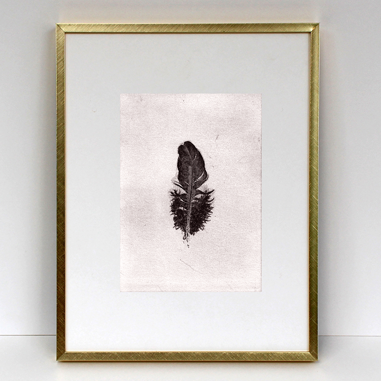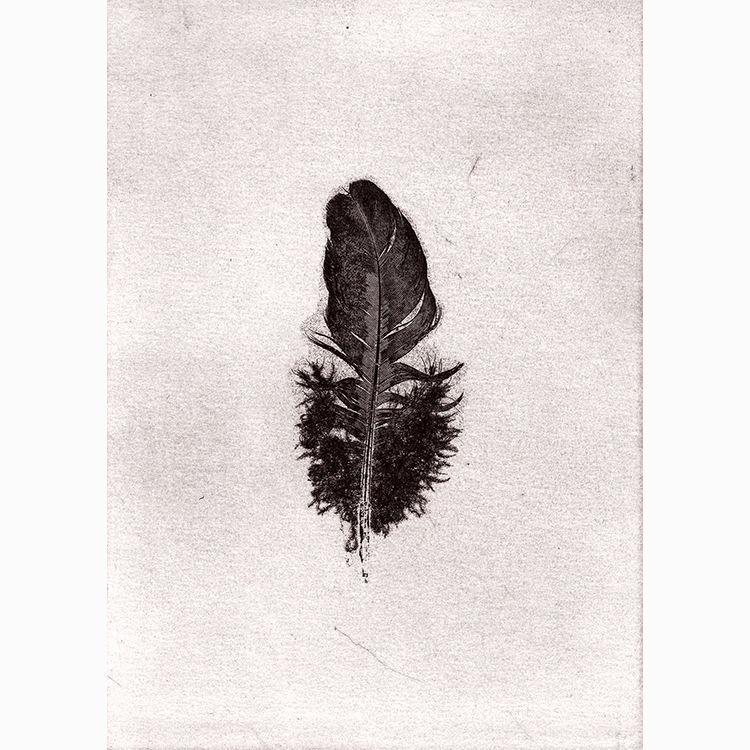 Pluma pullus (Chicken feather) is a collection of soft-ground etchings made from feathers shed by our family’s flock of chickens as they molt, and collected by my children in the backyard of our Kirkwood, Missouri home.