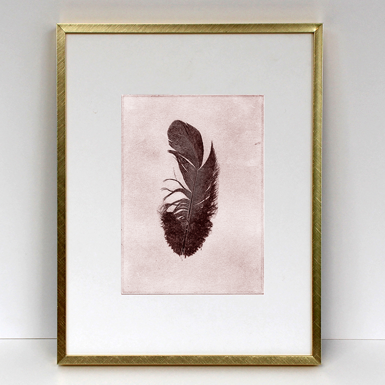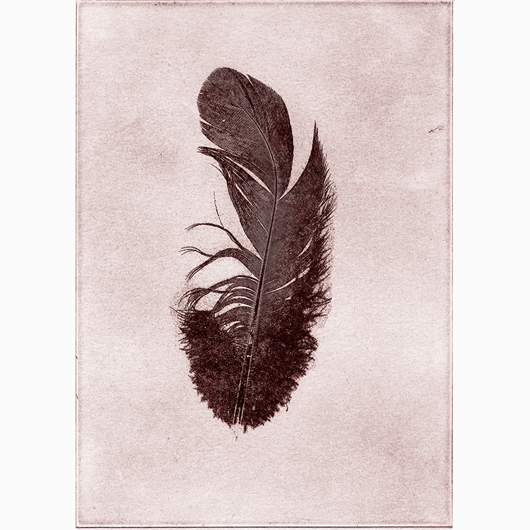 Pluma pullus (Chicken feather) is a collection of soft-ground etchings made from feathers shed by our family’s flock of chickens as they molt, and collected by my children in the backyard of our Kirkwood, Missouri home.